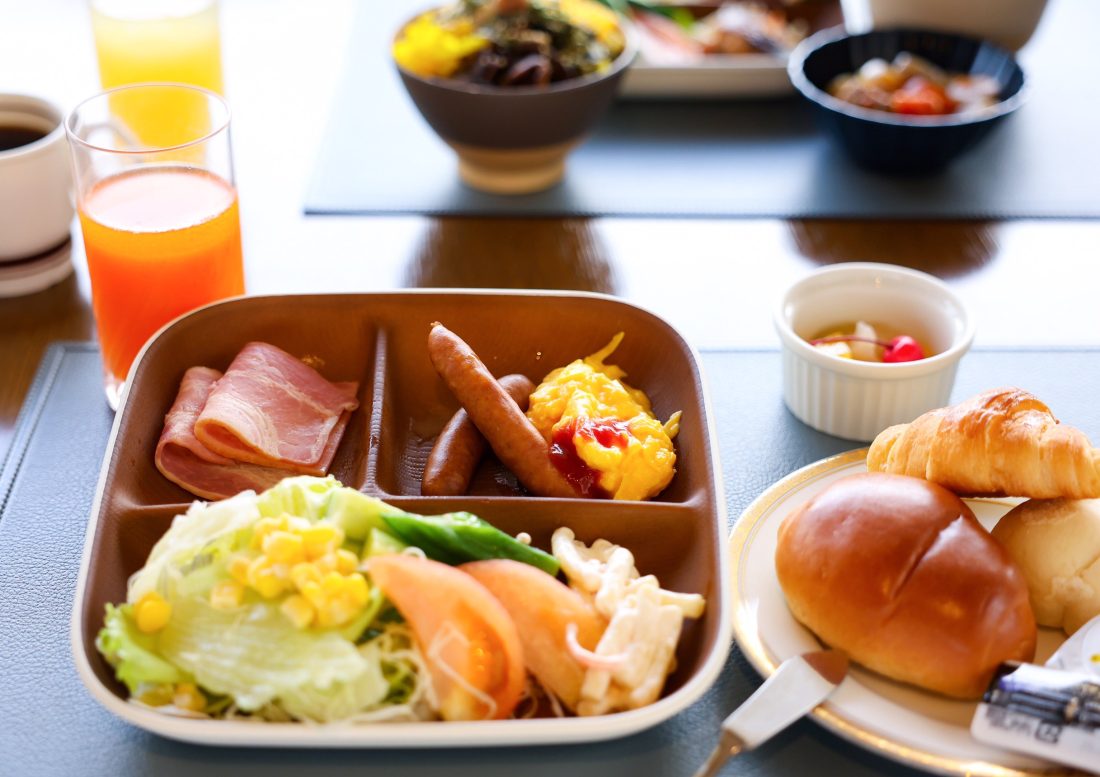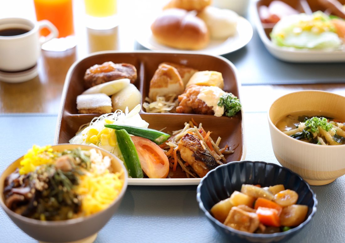 かのやグランドホテルの朝食バイキングでは、鹿児島の食材を中心に、和洋さまざまなメニューをご用意しております。